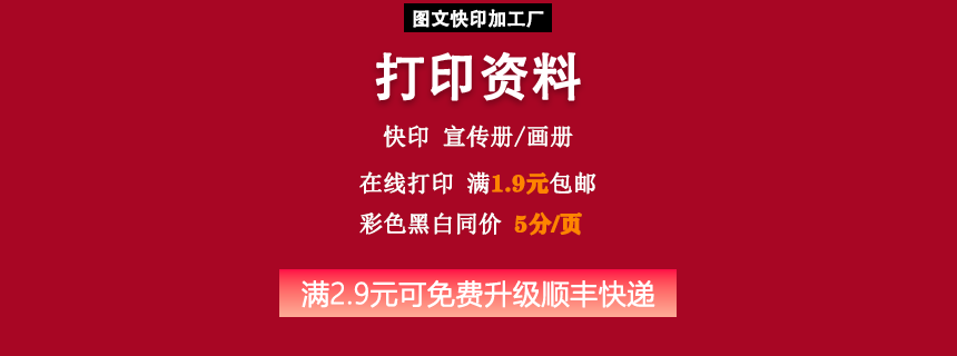 黑白/彩印都是5分一面,满2.9元包邮,打印100页彩印仅5元~ 湖南长沙发货,中通快递,17点之前的订单,可以当日发货,全国7省市可以次日达,完全可以满足大部分同学对学习资料的时效性。 长按下方二维码,可上传PDF/Word/PPT文件(支持微信上传、手机本地上传、百度网盘、P...