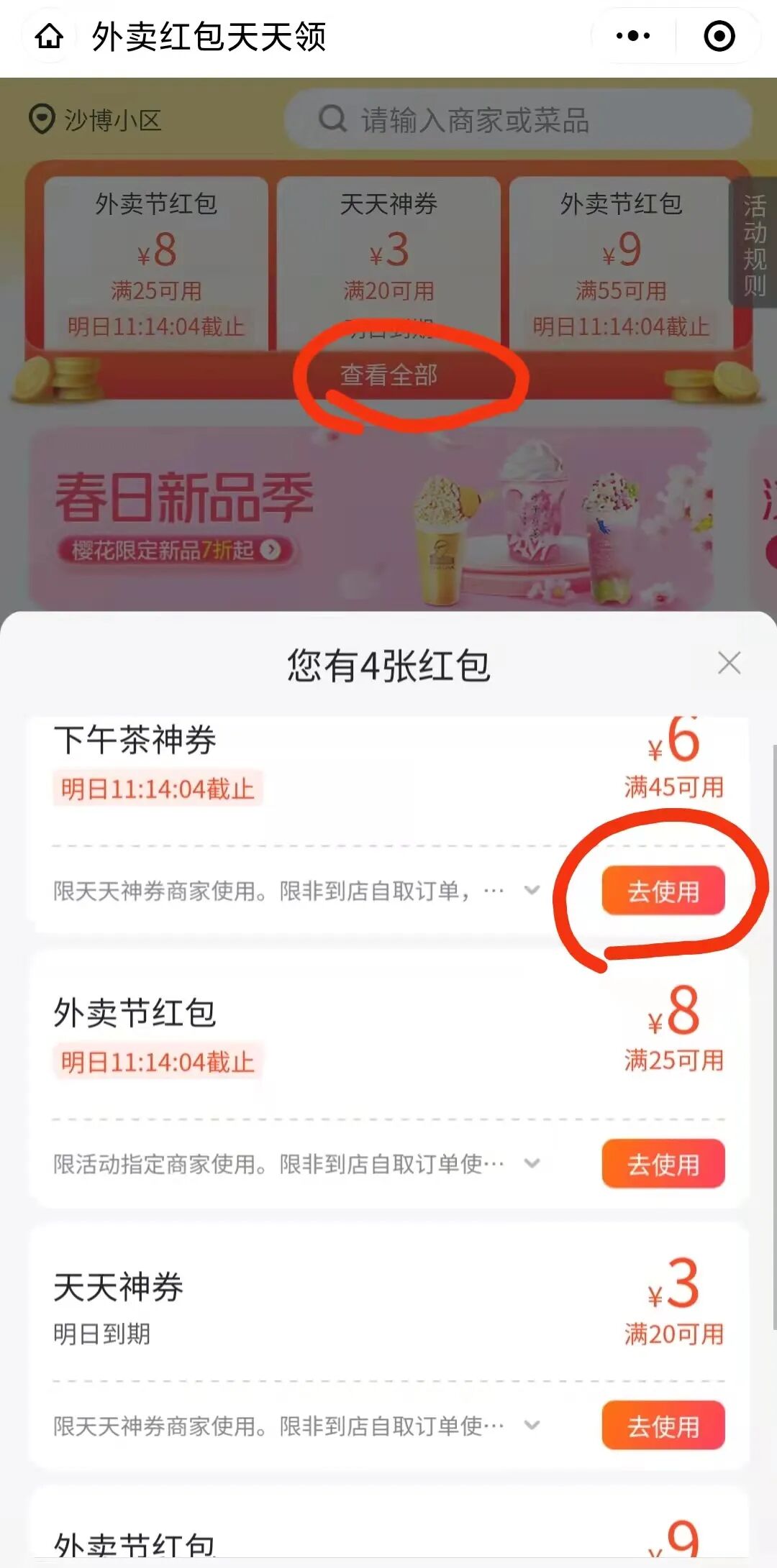 2.领取成功后,点击查看全部,再点击去使用,就能找到红包指定商家使用的商店下单点餐啦~