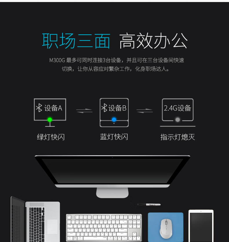 雷柏M300G無線鼠標,擁有三種連接模式,藍牙、4.0/3.0還有無線2.4G真是讓人舒適省心,職場三面,高效辦公,人體工學精緻小巧,砂磨表面質感細膩,鬆弛有度自由調節,高精度引擎馳聘無界,一手掌握大手的不建议购买,手小的用起来才舒服