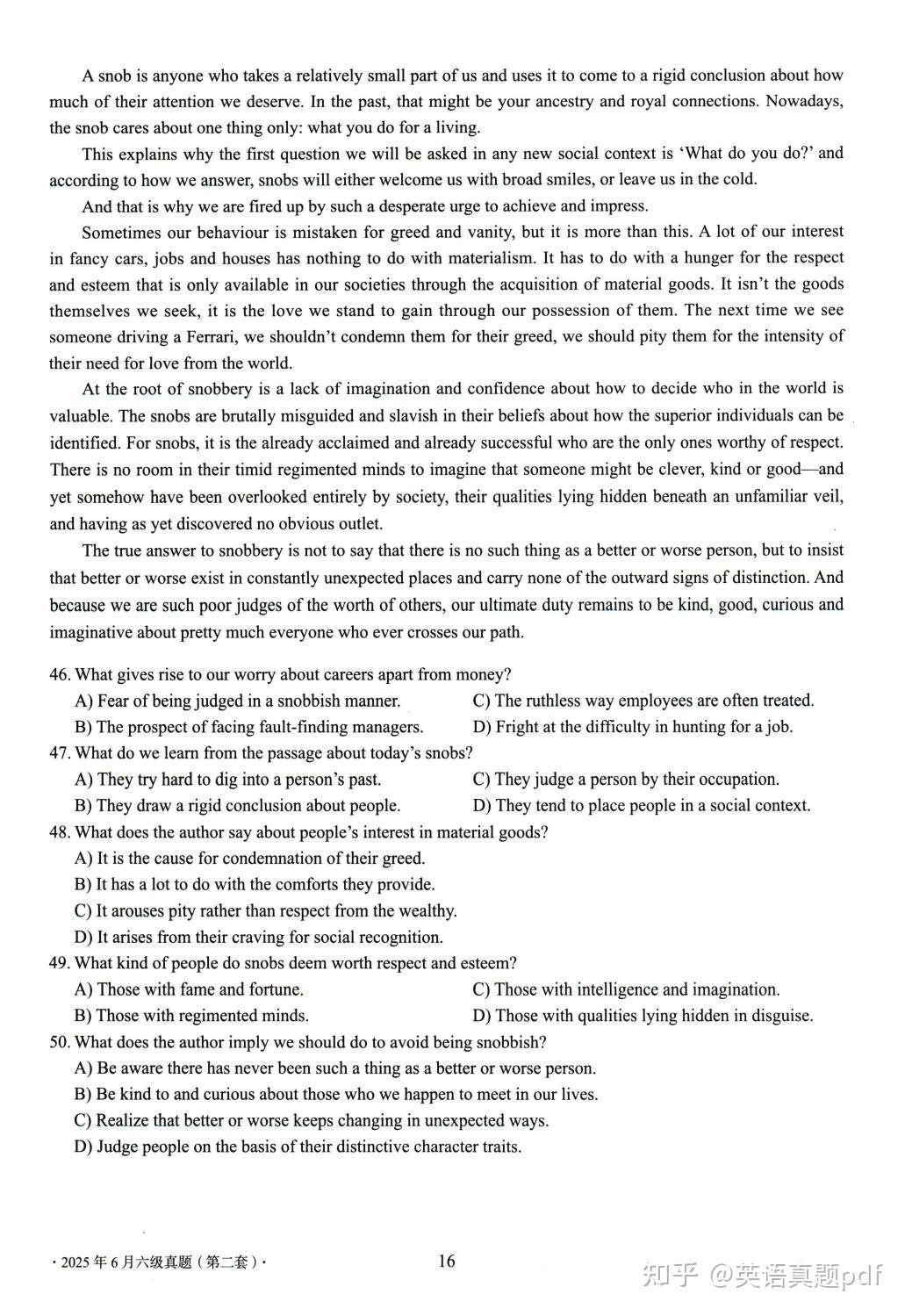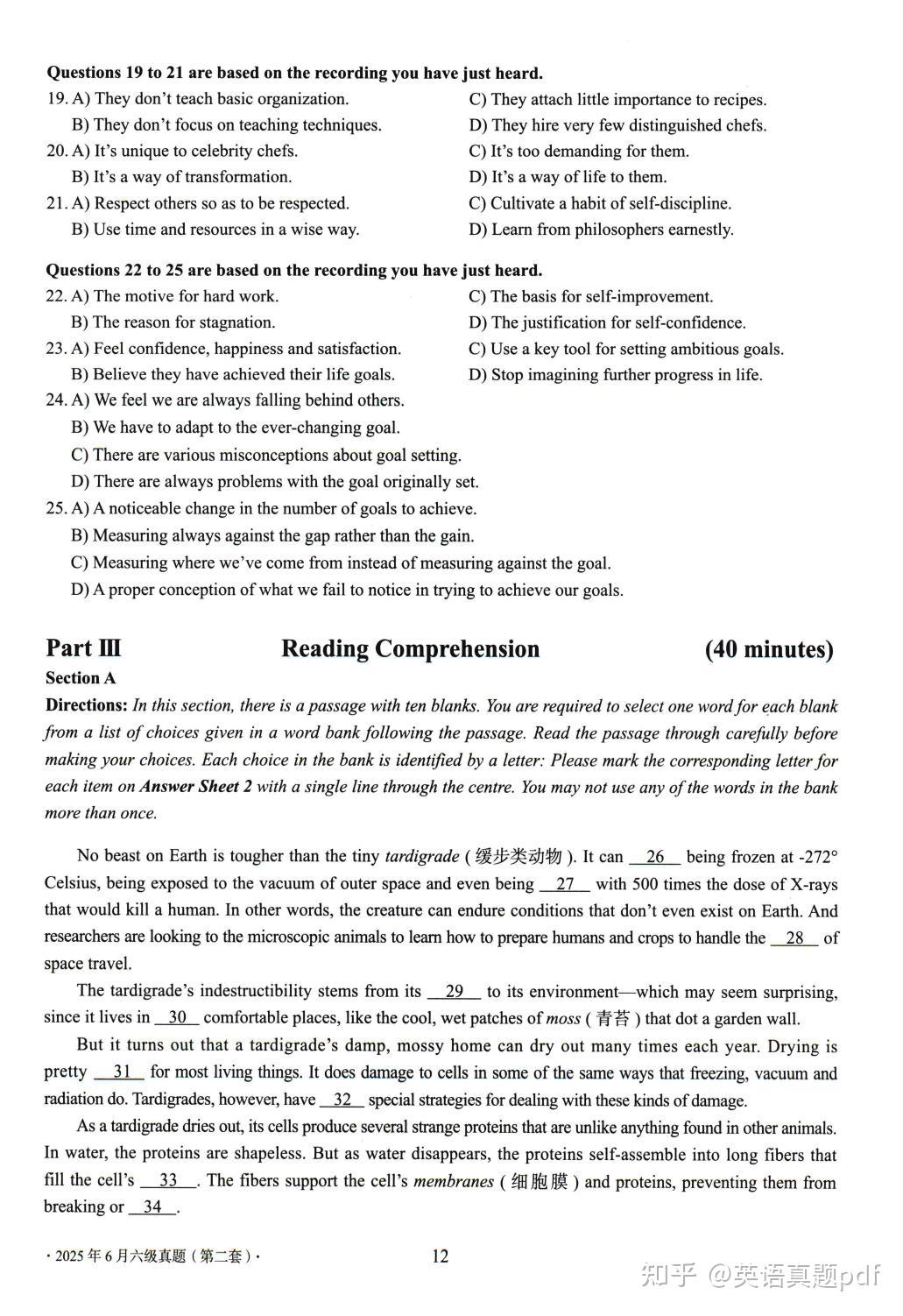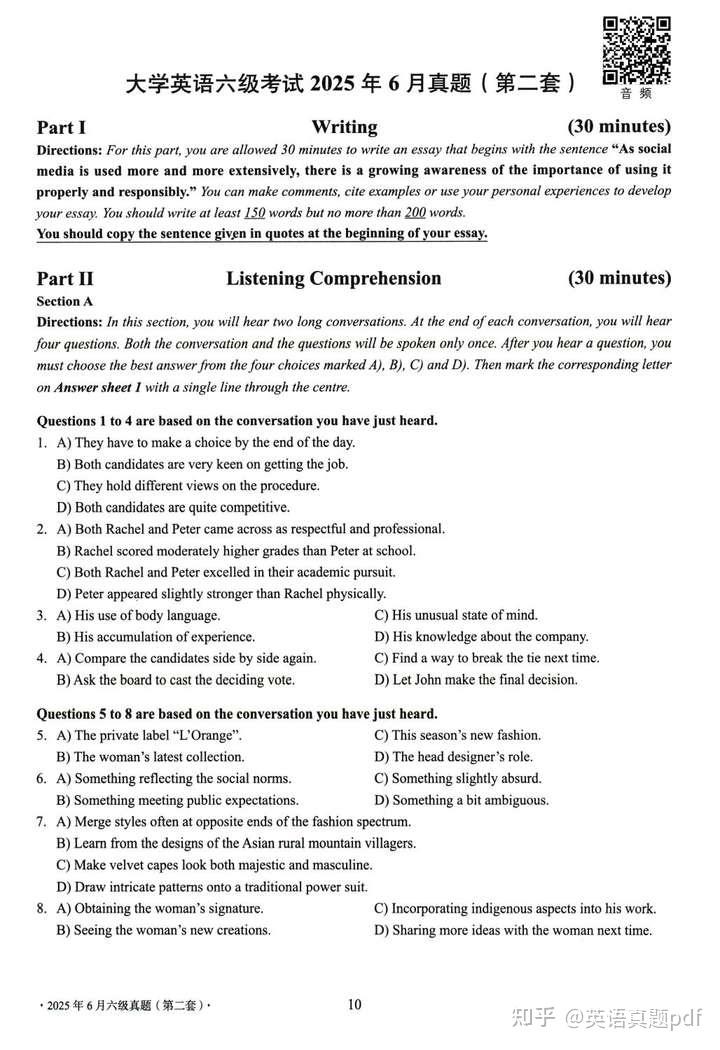 2025年6月大学英语六级真题第二套已经整理好了,需要下载打印的同学可以网盘下载链接: